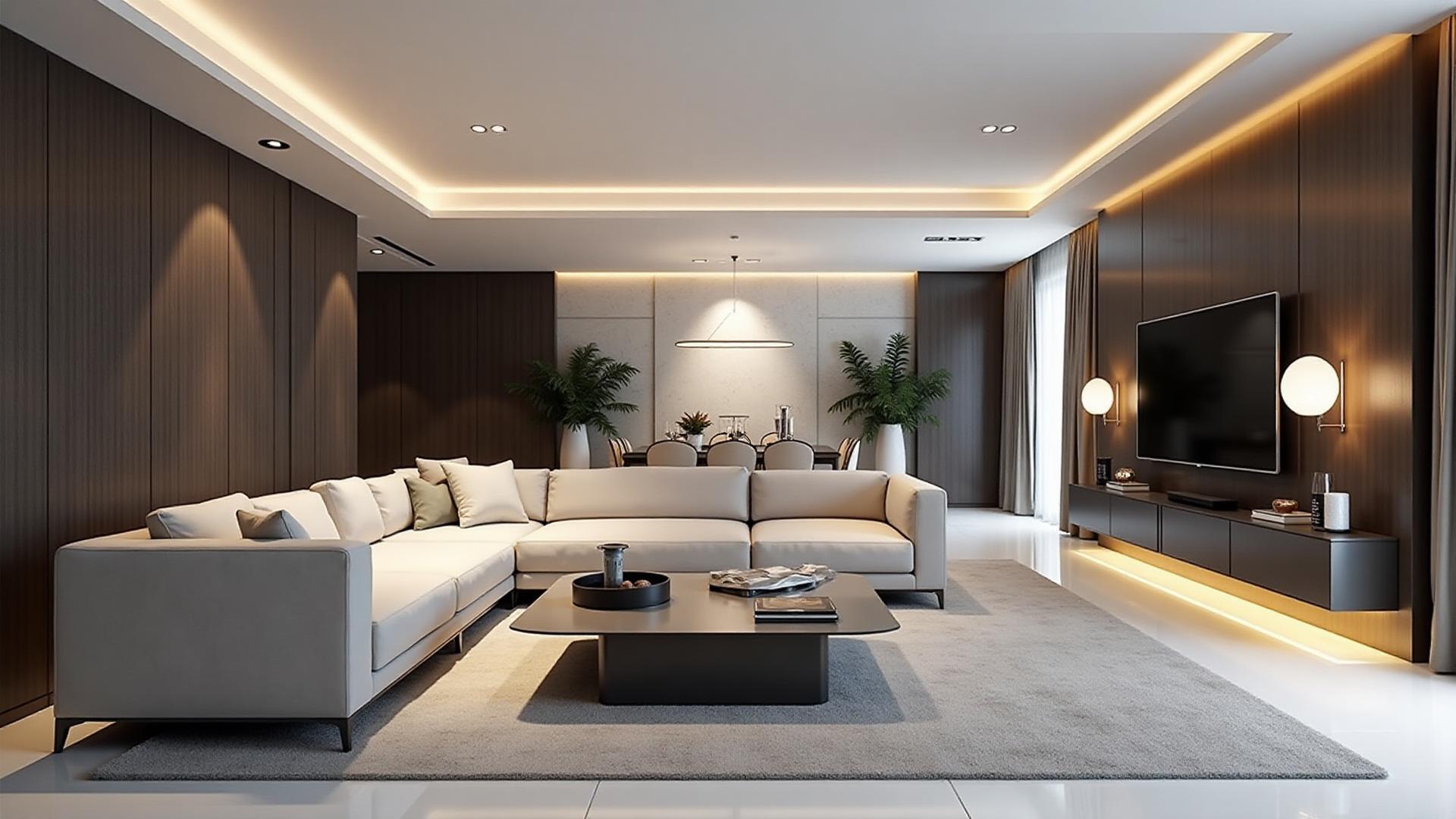 Layered textures and controlled lighting plan designed for everyday comfort and hosting.